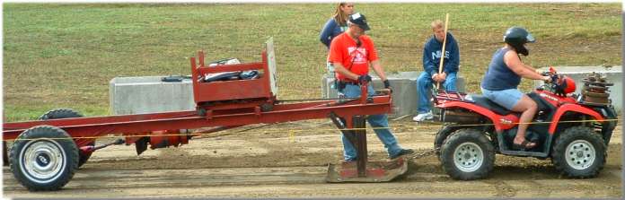 Driver must stay seated at all times; driver must wear helmet; No sharing of weights with drivers in your class; No more than 2 machines per driver per class; No more than 1 run per machine per class; minimum of 6 machines to have a class; No compressed gases; No one under 18 will be allowed to operate in the unlimited classes; officials discrimination will be used on stock classes; No alcohol or drug consumption by drivers or pit crew before or during the events; All machines must weigh out after their pull and weigh at or under their limit NO VARIANCE; All machines must have operating brakes; if your machines breaks during your pull you may fix it and move to the last position; All machines will be inspected in line up; machines must have ATV chassis and engine; walking speed only, this is for everyone’s safety; Anyone operating in the unlimited class must wear long pants; HITCHES: will be measured in a designated area with driver and weight on machine; BALL may not extend past rear tires or ahead of rear axle; Must have 1 7/8” ball.