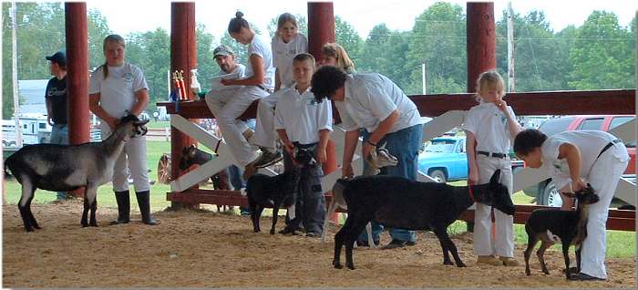 The Youth show is open to all persons ages 5 - 19. Goats do not have to be registered, however, animals will be checked by the show chairperson before being unloaded at the fairgrounds. Animals must be in good health and free from disease and sores. Entries should be sent to Sally Punik, and must be received by no later than August 10th. All exhibitors are required to participate in the showing and fitting classes. Entries should include: Name and address of breeder; phone number and/or email address; animal’s name; class number: animal’s age; animal’s breed. Breeds to be shown are: Alpine, Nigerian Dwarf, Recorded Grade, and all other breeds (including: boer, pigmy, lamancha, Nubian, oberhasli, saanen/sable, toggenburg). Junior does, Senior does, and wethers are eligible. No bucks allowed. Base date for age computation is August 28th, 2011. There are no entry fees. Participate in the special activities listed at the end of these rules. A herdsman award will be given to the exhibitor demonstrating: cleanliness of pen and pen area and overall cooperation. Exhibitors are encouraged to wear white in the show ring. Classes: